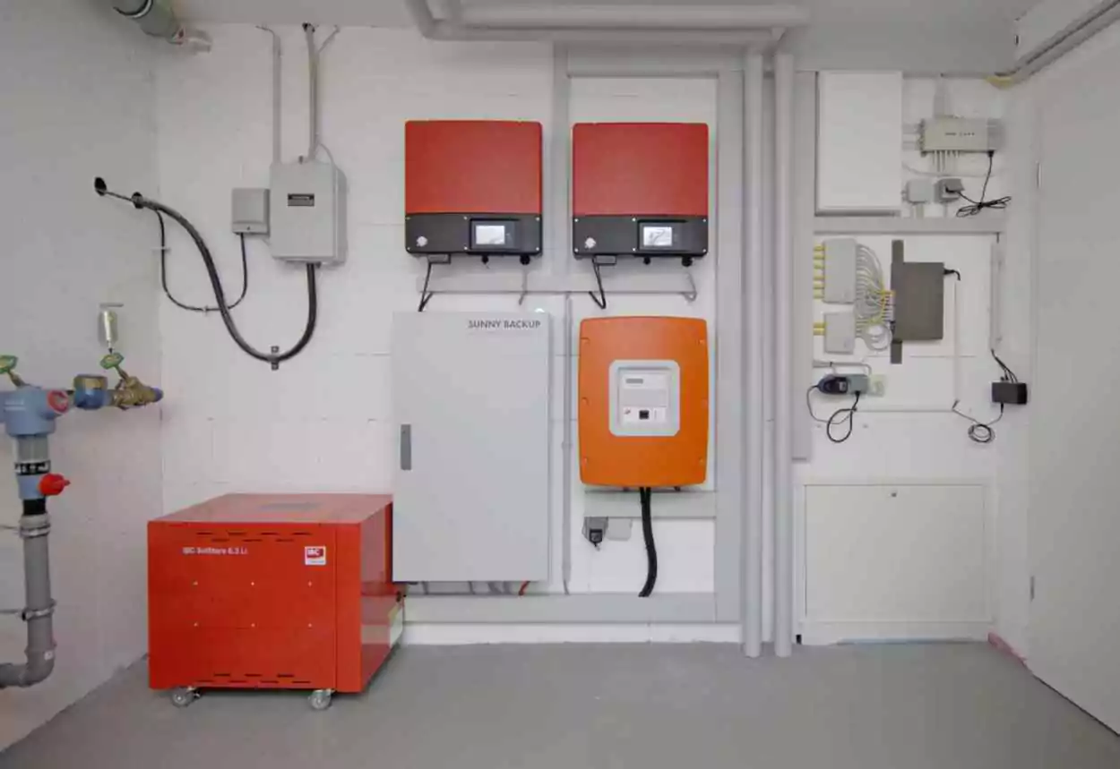 Die Photovoltaik-Anlage produziert knapp 6.000 Kilowattstunden Strom im Jahr. Nicht genutzter Strom wird in einer Lithium-Ionen-Batterie mit einer Kapazität von 6,3 Kilowatt im Technikraum gespeichert, erst dann wird überschüssiger Strom ins Netz eingespeist. Die Photovoltaikmodule und Solarkollektoren sind im Kombisystem optisch ansprechend auf dem Dach montiert.
