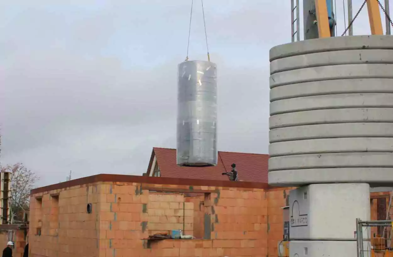 Der knapp fünf Meter hohe Wärmespeicher, der hier über dem Rohbau schwebt, wird die Wärme von 40 Quadratmetern Solarkollektoren zwischenspeichern. Foto: Sonnenhaus-Institut