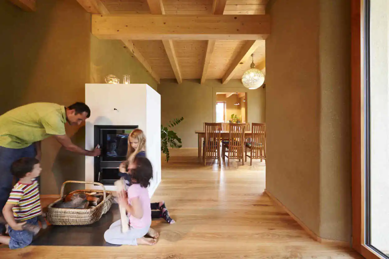 Wassergeführte Holzfeuerung in einem klassischen Sonnenhaus. Foto: Sonnenhaus-Institut / Petra Höglmeier