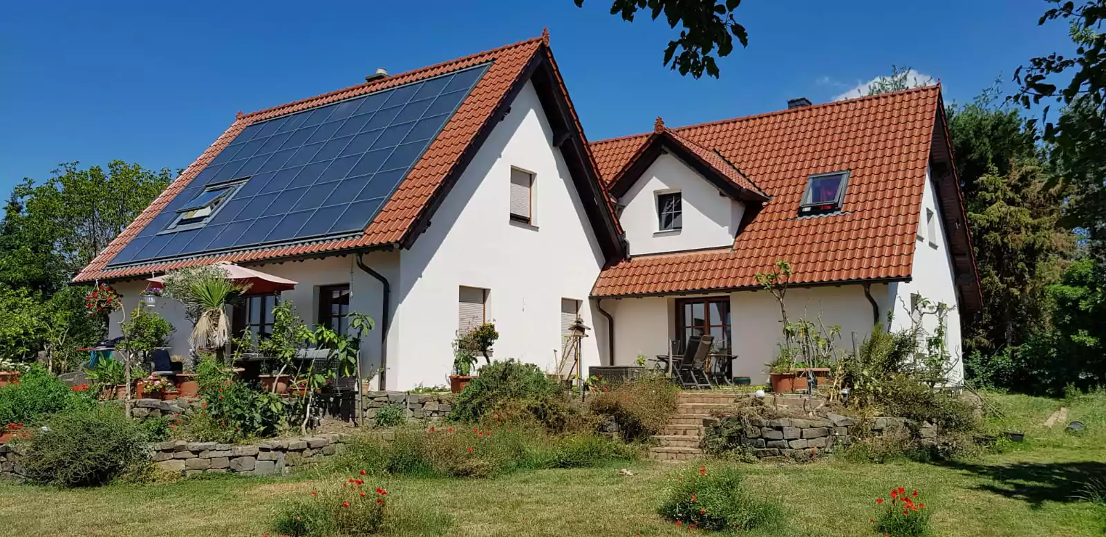 Hier im Bild bei schönstem Sommerwetter: links der Anbau mit Solardach sowie die alte Bausubstanz im rechten Bereich. Foto: Sonnenhaus-Institut/Melanie Gronau