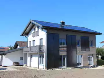 Autarkes Sonnenhaus, KfW40 (EnEV 2014) Standard, Passivhaus Bauweise, Fassade mit Einbaukollektoren, Dach mit In-Dach Photovoltaik, elektrischer Verbrauch inklusive 30’000 km/a Elektrofahrzeug; Optimierung bezüglich hohen Autarkiegraden bei gleichzeitig relativ kleinen Speichern