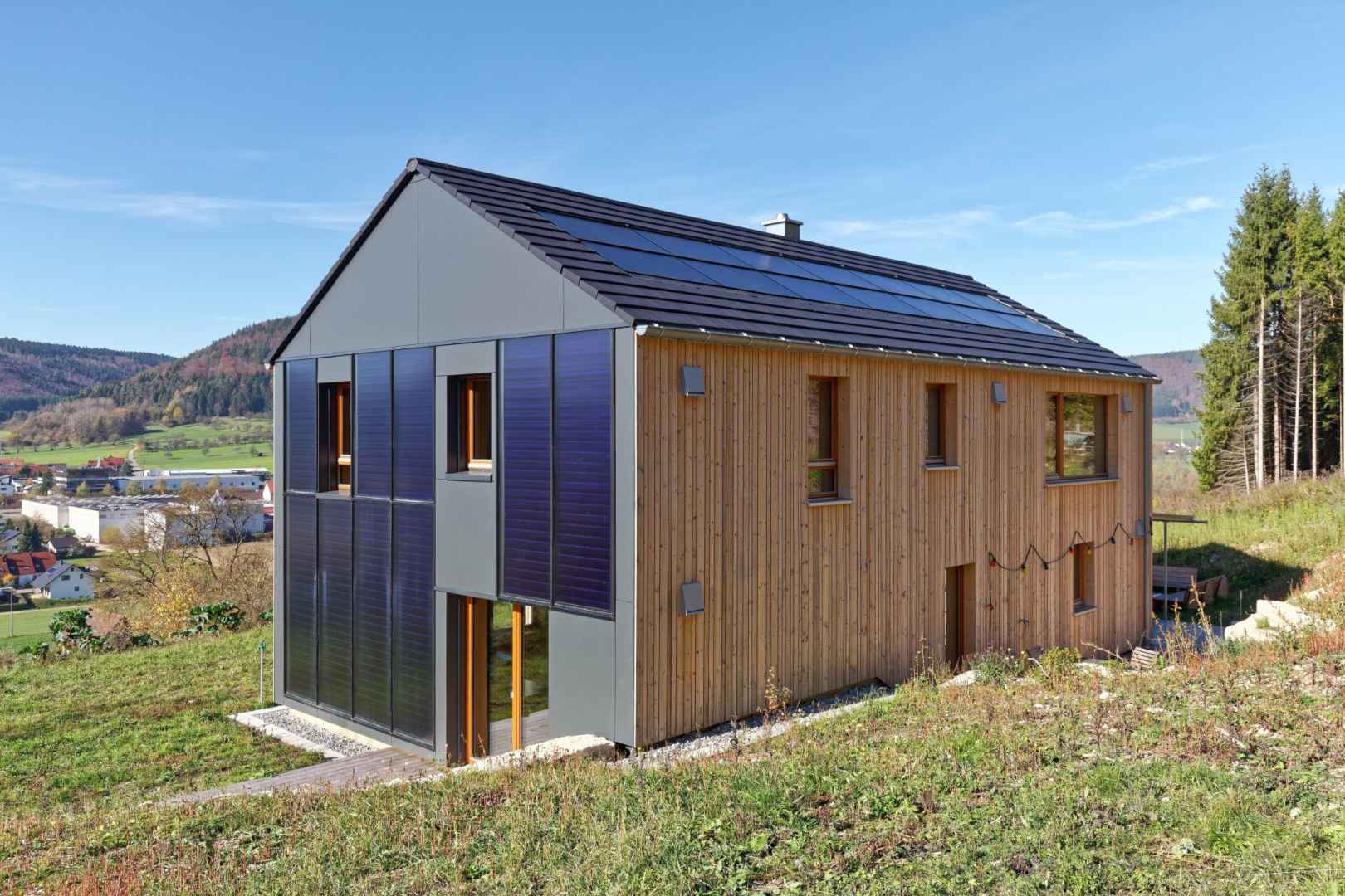 Auf dem Dach erzeugt eine Photovoltaikanlage Strom, an der Fassade produziert die Solarthermieanlage Wärme für die Raumheizung und das Warmwasser. Foto: Sonnenhaus-Institut / Arno Witt